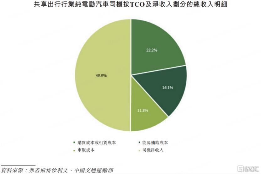 进一步来看,共享出行行业的核心成本在于车辆的全生命周期成本,也就是TCO。从纯电动汽车司机的角度看,司机净收入占总收入的比例不到一半,而车辆成本(包括购买成本或租赁成本、能源补给成本、车服成本)占总收入一半以上。其中,购买成本或租赁成本占比约为22.2%。