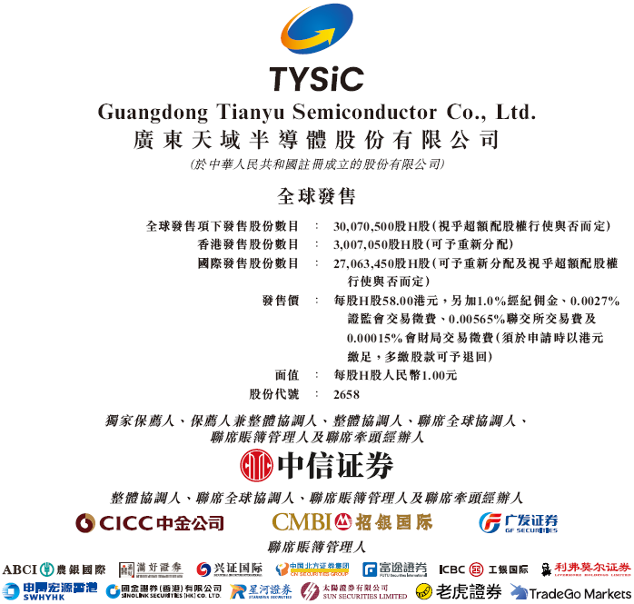 天域半导体,计划全球发售3007.05万股H股(占发行完成后总股份的7.65%),其中90%为国际发售、10%为公开发售,另有15%超额配股权。每股发售价介58.00港元,每手50股,入场费2,929.24港元,最多募资约17.44亿港元。