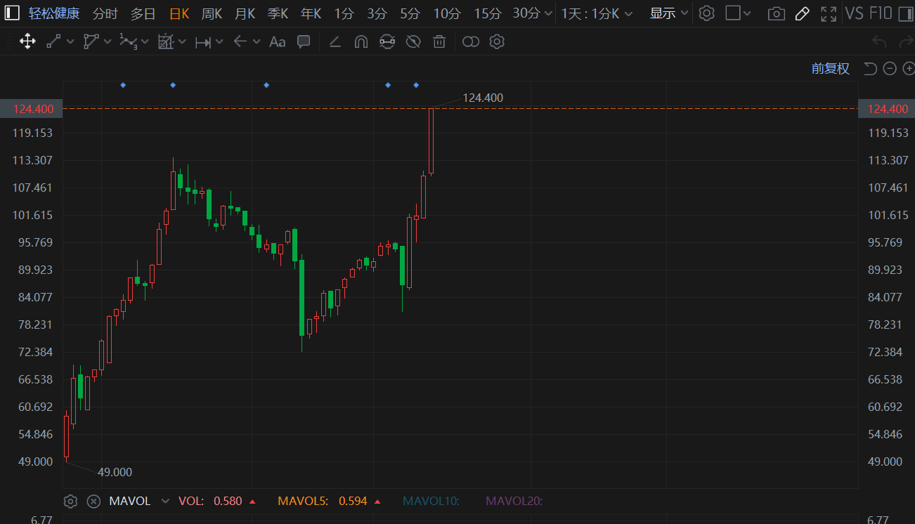 轻松健康(2661.HK)再度拉升涨超13%,报124.4港元刷新上市以来新高价,并且录得4连升累计涨幅超过40%,总市值大256.7亿港元。