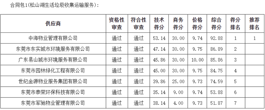 例如,11月10日,中海物业以综合得分92.88中标广东东莞松山湖生活垃圾收集运输服务项目,成交金额118.89万元,服务时间为3年,排名靠后的企业除世纪金源物业服务集团外,多为东莞市本地环卫企业。