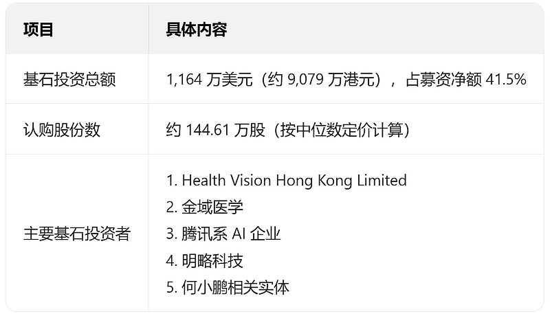 按发售价中位数62.15港元计算,基石投资者合计认购股份约144.61万股,占此次发售股份总数的30.4%,为上市后股价稳定提供重要支撑。