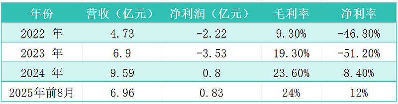 财务层面,公司已实现盈利突破。2022-2024年营收从4.73亿元增至9.59亿元,复合年增长率达42.3%。2022-2024年净利润分别为-2.15亿元、-3.51亿元、8380.50万元,2024年同比增幅达123.90%,正式告别连续亏损状态。2025年前八个月,收入达6.96亿元,净利润8321万元,真正从投入期进入了盈利期。
