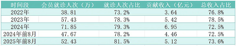 卓正营销费用占比极低,2022-2024年只占收入的1.2%到2.7%,主要依靠会员口碑推荐获取新客户,大幅节约了市场费用。2025年前八个月,会员贡献81.5%的就诊人次和73.6%的总收入,金额达5.12亿元。