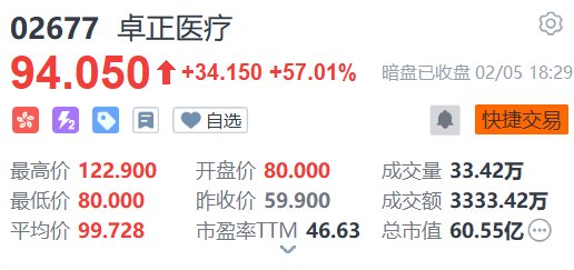 中国私立医疗服务机构卓正医疗(2677.HK)将于明日(2月6日)在港上市,富途行情显示,该股暗盘段收报94.05港元,较招股价59.9港元大涨57.01%,每手50股,不计手续费,一手赚1707.5港元。
