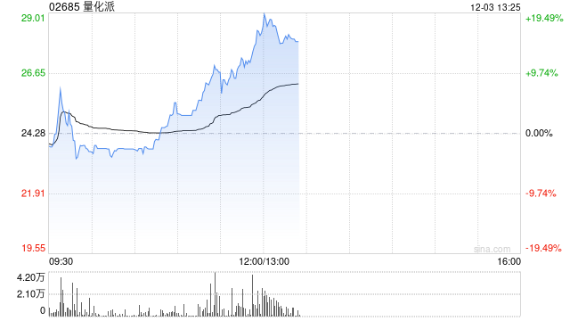 量化派一度飙升超20%,盘中股价创新高,报价29.18港元。截止发稿,成交额超3075万港元,上市以来累计涨幅超186%。