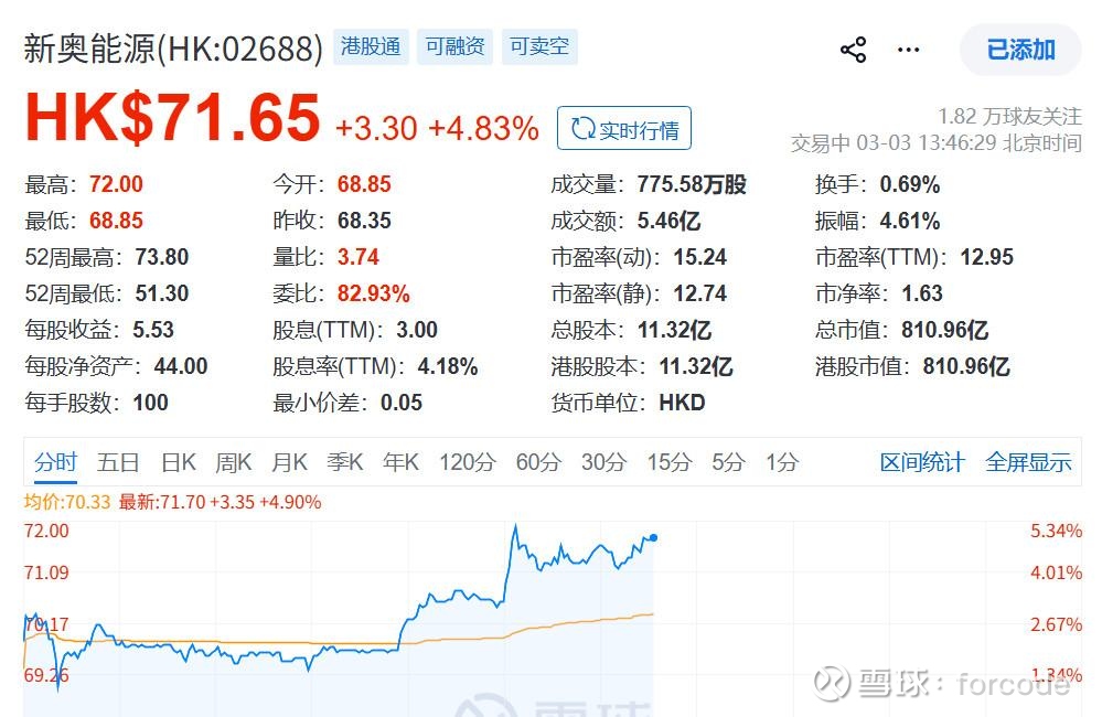 昨天发帖时,新奥能源67.6,今天最高涨到72了,减仓了50万,盈利七八万,本来只想套利赚几个点而已,意外收获……