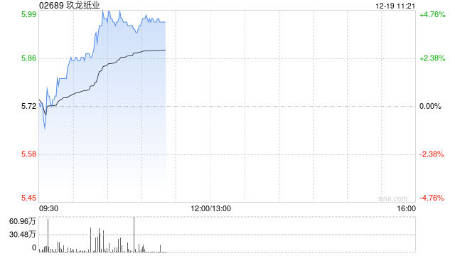 玖龙纸业(02689)早盘股价上涨4.20%,现报5.96港元,成交额4600.64万港元。