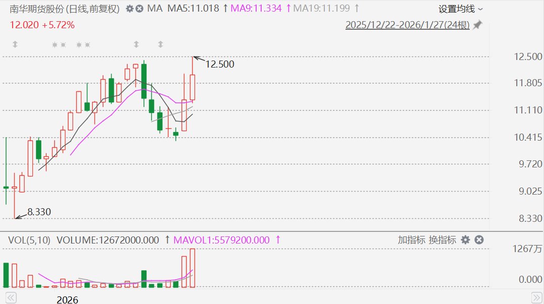 格隆汇1月27日|延续昨日涨势,南华期货股份(2691.HK)今日盘中再度涨近10%至12.5港元,股价创上市新高。消息面上,1月19日,南华期货股份获纳入港股通。另外,南华期货近日在互动平台回答投资者提问时表示,公司境内外经纪业务、场外衍生品业务等相关业务涉及黄金、白银等期货品种。华西证券此前指,公司期货业务牌照齐全,全球化布局成效显著,境外业务具备优势,将继续作为公司业务的主要抓手,帮助公司实现快速发展。