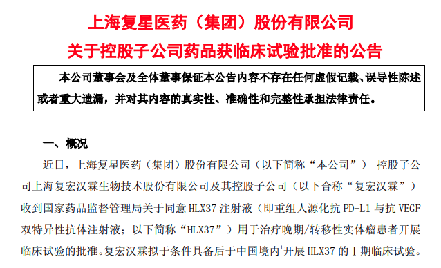 12月1日,复星医药发布公告,称其子公司复宏汉霖已收到药监局关于同意 PD-L1/VEGF 双抗 HLX37 注射液用于治疗晚期/转移性实体瘤患者开展临床试验的批准。