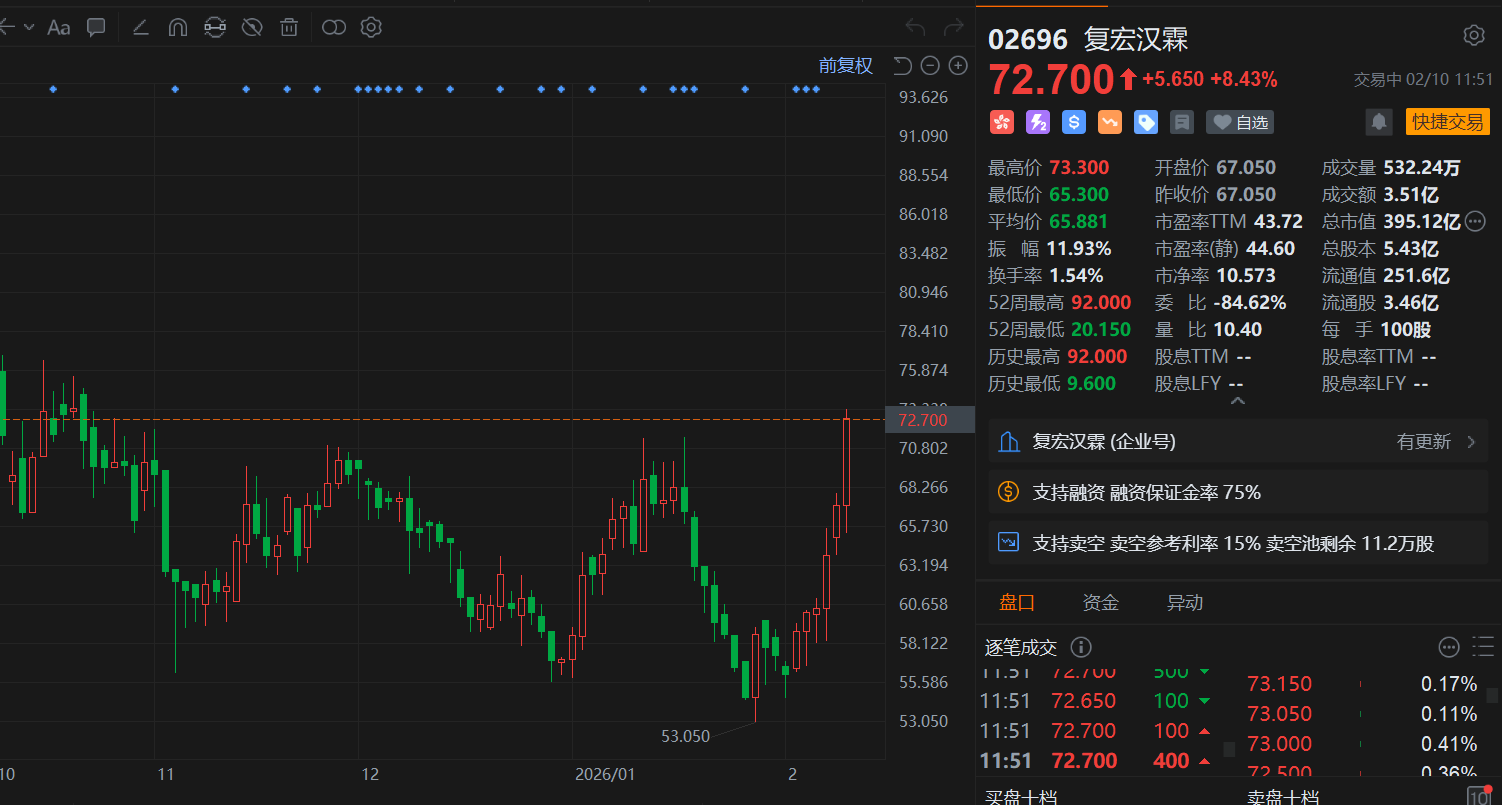 复宏汉霖(2696.HK)再度拉升涨超8%,6日连涨高达30%,并且走出反转行情,现报72.7港元,总市值396亿港元。