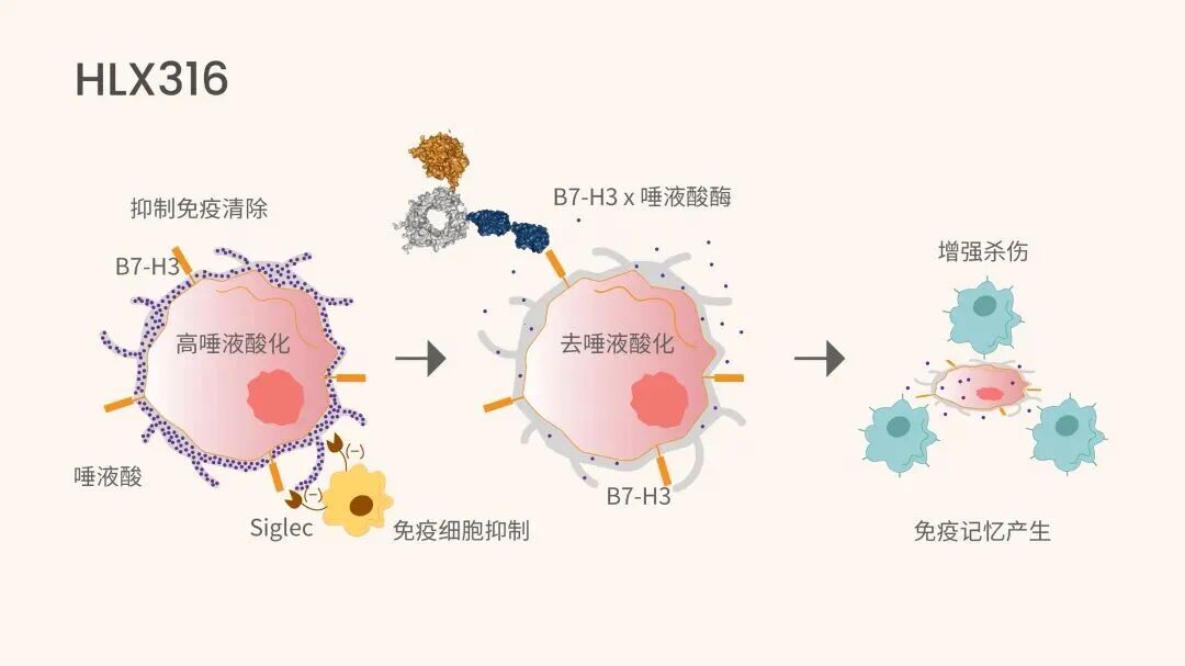 HLX316是一款基于蛋白工程平台开发的靶向B7同源物3(B7-H3/CD276)的人唾液酸酶融合蛋白。HLX316针对癌症中两种关键的免疫逃逸途径,即B7-H3过表达和肿瘤高唾液酸化。B7-H3是一种免疫检查点蛋白,在肺癌、乳腺癌、结直肠癌、胰腺癌、前列腺癌和卵巢癌等多种实体肿瘤中过表达,其与肿瘤进展和预后不良相关,但在正常组织中的表达水平很低。肿瘤高唾液酸化可以衔接白细胞上的抑制性 Siglec 受体,从而削弱先天性和适应性免疫效