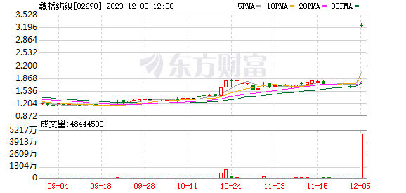 受益于私有化利好,魏桥纺织(02698.HK)今日开盘即走强。截至发稿,涨90.06%,报3.25港元,成交额超1亿港元。