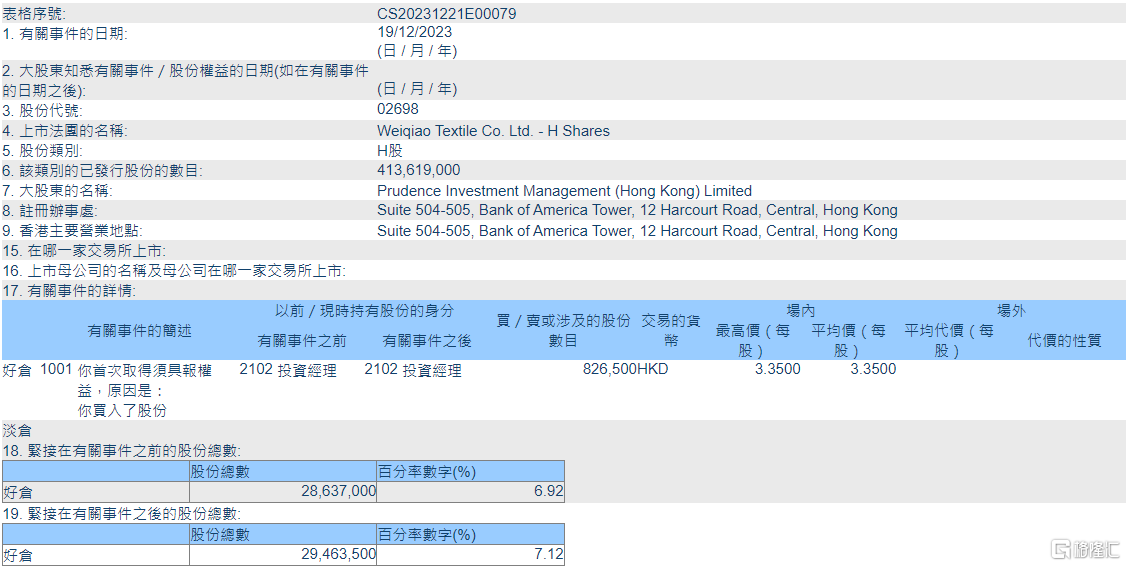 格隆汇12月22日丨根据联交所最新权益披露资料显示,2023年12月19日,魏桥纺织(02698.HK)获Prudence Investment Management (Hong Kong) Limited在场内以每股均价3.35港元增持82.65万股,涉资约276.9万港元。