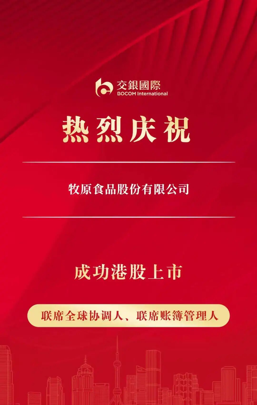 2月6日,牧原食品股份有限公司(“牧原股份(002714)”,2714.HK)在香港联交所主板挂牌上市,交银国际担任联席全球协调人、联席账簿管理人兼联席牵头经办人。该项目是交银国际2026年完成的第3单港股上市项目。牧原股份本次全球发售定价每股39.00港元,发行273,951,400股H股,融资规模约106.84亿港元。若超额配售权悉数行使,募资净额最高可达120.38亿港元,这不仅是2026年以来全球规模最大的农牧企业IPO,更跻身近年来港股农业板块最大规模IPO行列。