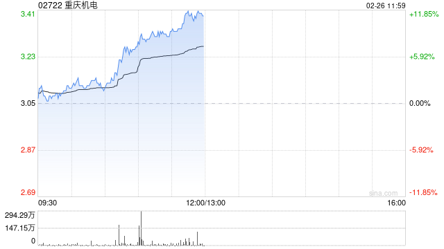 重庆机电(02722)早盘涨超11%,高见3.41港元,再创历史新高。截至发稿,股价上涨11.15%,现报3.39港元,成交额7425.15万港元。