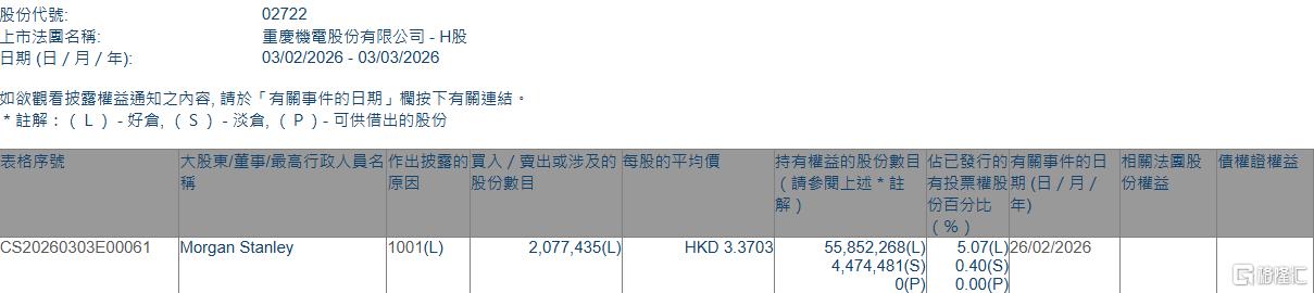 格隆汇3月3日丨根据联交所最新权益披露资料显示,2026年2月26日,重庆机电(02722.HK)获Morgan Stanley在场内以每股均价3.3703港元增持好仓207.74万股,涉资约700.16万港元。