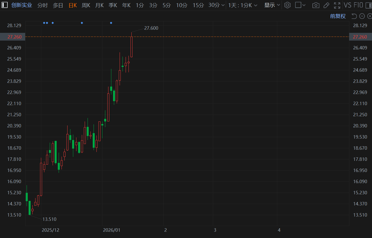 消息上,创新实业聚焦于铝产业链上游中的氧化铝精炼和电解铝冶炼。2026年以来,电解铝价格大幅上涨。机构指出,2026年整体供需偏紧逻辑仍然成立,因此,尽管当前电解铝下游采购情绪偏谨慎,但不改变中长期电解铝利润中枢进一步上移趋势,行业高利润周期有望延续。在此预期下,持续看好26H1电解铝板块公司利润进一步走阔。
