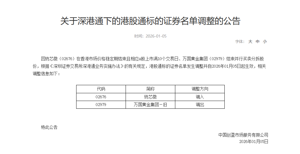 1月5日,深交所公告,因纳芯微(02676)在香港市场价格稳定期结束且相应A股上市满10个交易日、万国黄金集团(02979)结束并行买卖分拆股份,根据《深圳证券交易所深港通业务实施办法》的有关规定,港股通标的证券名单发生调整并自2026年01月05日起生效。