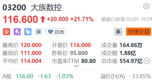 格隆汇2月5日|“内地最大的PCB专用生产设备制造商”大族数控(3200.HK))将于明日(2月6日)在港上市,富途行情显示,该股暗盘段收报116.6港元,较招股价95.8港元涨21.71%,每手100股,不计手续费,一手赚2080港元。