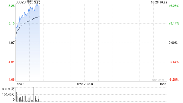 华润医药(03320)早盘涨超6%,截至发稿,股价上涨6.24%,现报5.28港元,成交额1.92亿港元。