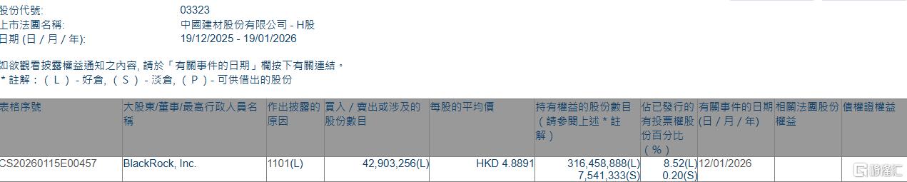 格隆汇1月19日丨根据联交所最新权益披露资料显示,2026年1月12日,中国建材(03323.HK)获BlackRock, Inc.在场内以每股均价4.8891港元增持好仓4290.33万股,涉资约2.1亿港元。