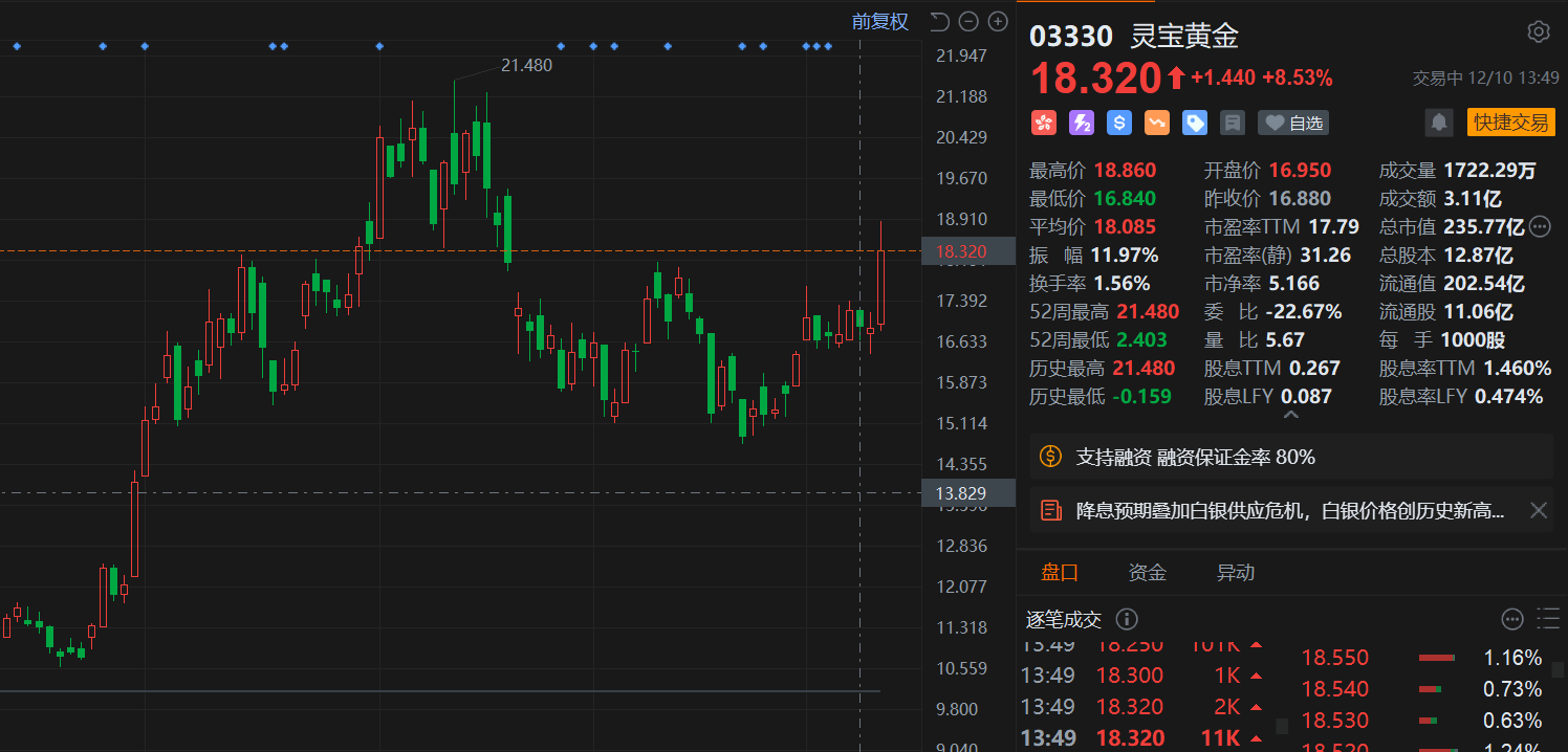 灵宝黄金(3330.HK)盘中大涨超11%,现报18.32港元创近2个月新高价,总市值235.4亿港元。