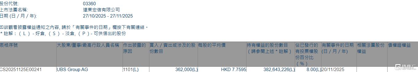 格隆汇11月27日丨根据联交所最新权益披露资料显示,2025年11月20日,远东宏信(03360.HK)获UBS Group AG在场内以每股均价7.7595港元增持36.2万股,涉资约280.89万港元。