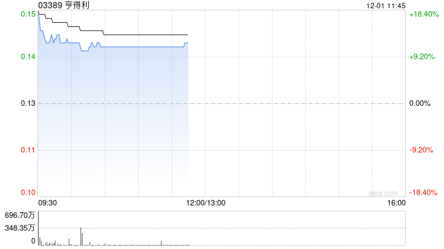 亨得利(03389)复牌后股价上涨12%,现报0.140港元,成交额502.39万港元。