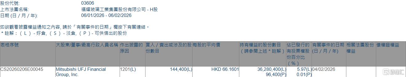 格隆汇2月6日丨根据联交所最新权益披露资料显示,2026年2月4日,福耀玻璃(03606.HK)遭Mitsubishi UFJ Financial Group, Inc.在场内以每股均价66.1601港元减持好仓14.44万股,涉资约955.35万港元。