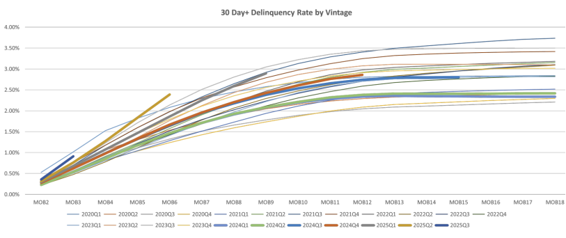 从放款信用损失率(vintage loss)来看,2025年下半年放款的资产风险呈显著抬升态势,其中2025年二季度放款截至MOB6的风险水平创下2020年以来新高。