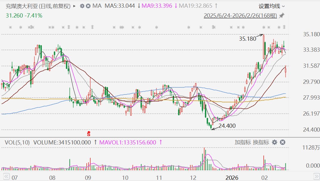兖煤澳大利亚(3668.HK)盘初一度跌超10%,报30.3港元。消息面上,公司公告,截至2025年12月31日止年度的年度业绩,经营收入由2024年的68.96亿澳元减少14%至2025年的59.10亿澳元,主要由于煤炭销售收入由2024年的67.66亿澳元减少15%至2025年的57.79亿澳元所致。