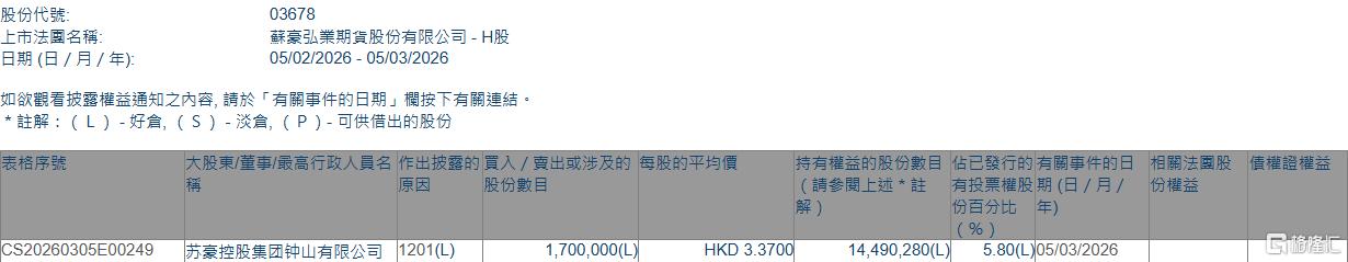 格隆汇3月5日丨根据联交所最新权益披露资料显示,2026年3月5日,弘业期货(03678.HK)遭苏豪控股集团钟山有限公司在场内以每股均价3.37港元减持170万股,涉资约572.9万港元。