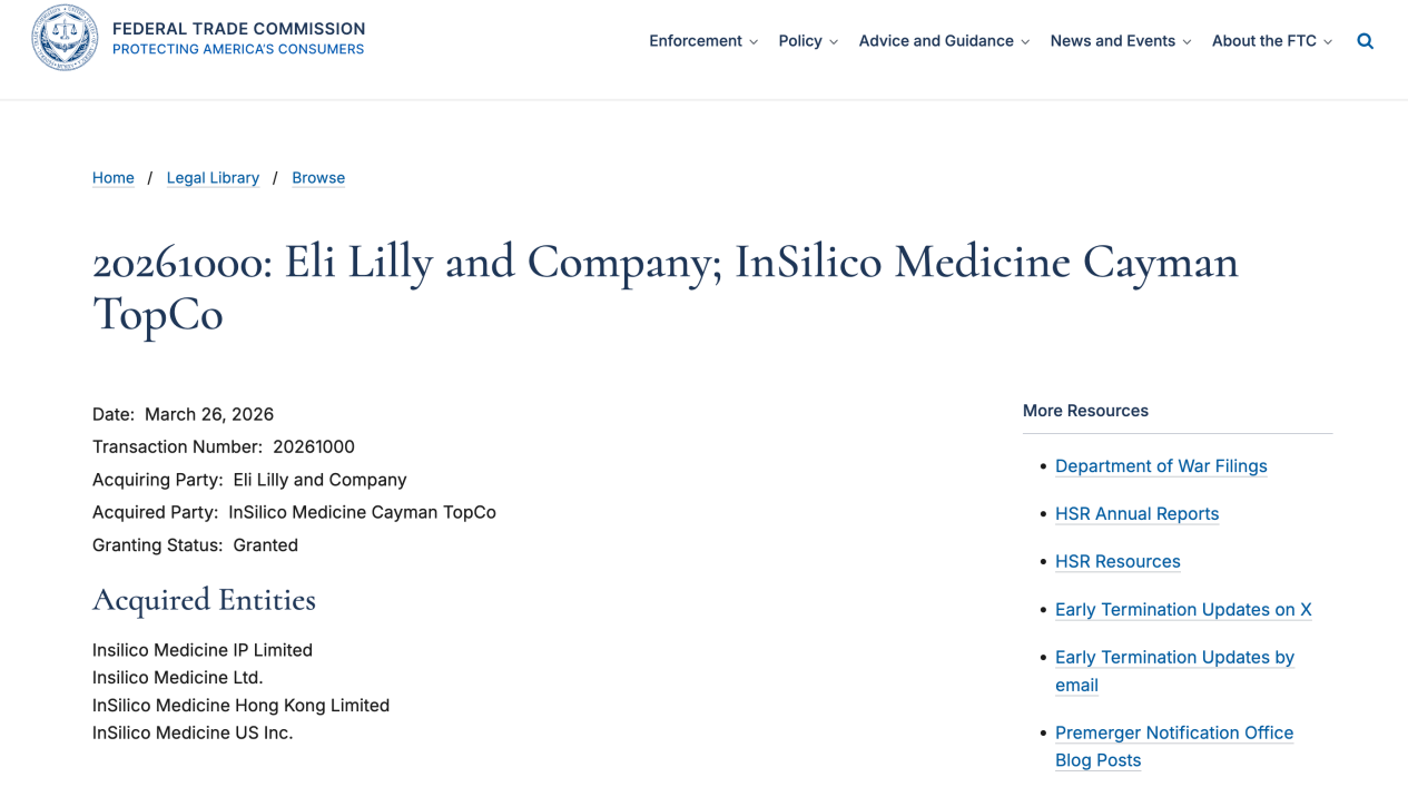 近日,有消息称,礼来(LLY.US)将收购AI制药企业英矽智能(03696.HK),已获得FTC(美国联邦贸易委员会,Federal Trade Commission)批准。财闻于3月29日向英矽智能联合首席执行官兼首席科学官任峰询问相关情况,任峰回应表示:“等我们明天一早的官方消息。”