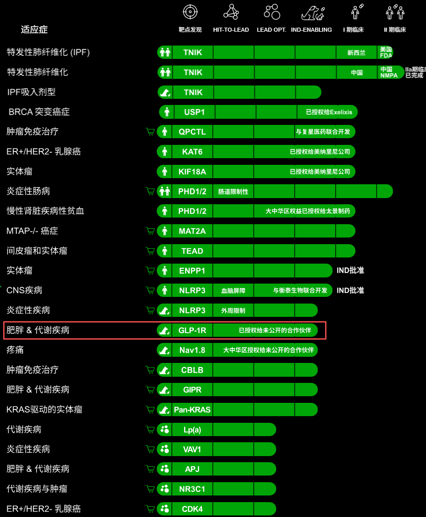 根据英矽智能官方网站披露的管线图,仅有一条用于肥胖和代谢疾病干预的创新管线被标注为授权给“未披露合作伙伴”,靶向GLP-1R,这正是礼来旗下年销售额365亿美元的“新药王”替尔泊肽的关键作用机制之一。