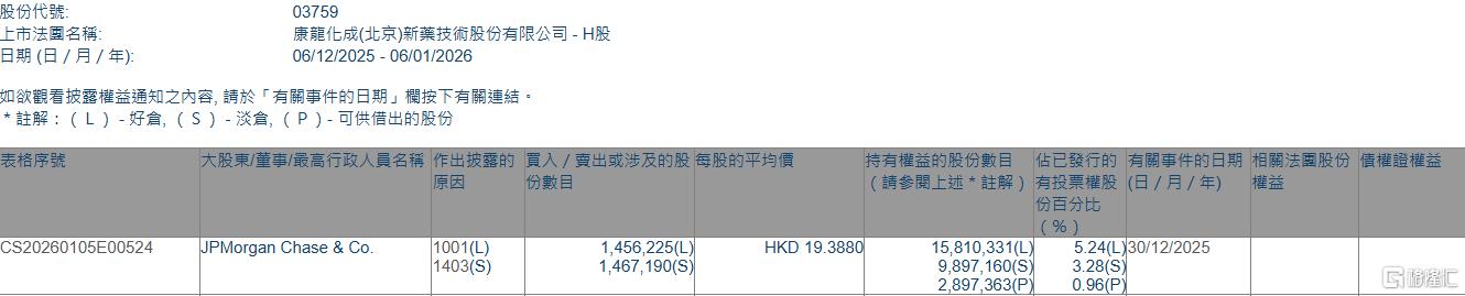 格隆汇1月6日丨根据联交所最新权益披露资料显示,2025年12月30日,康龙化成(03759.HK)获JPMorgan Chase & Co.以每股均价19.388港元增持好仓145.62万股,涉资约2823.33万港元。
