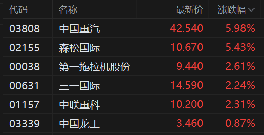 港股重型机械股继续走高,尤其是中国重汽盘中一度飙涨14%再度刷新历史新高,森松国际涨5.5%,第一拖拉机股份涨2.6%,三一国际、中联重科涨2.2%。
