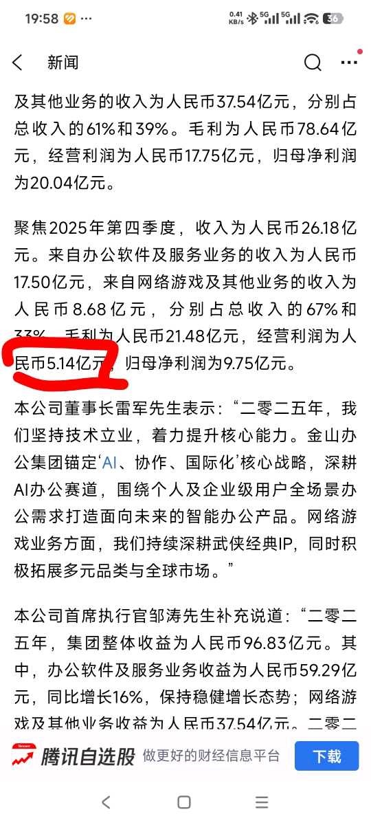 你看一下财务报表,港股的财务报表我看的有点迷糊,金山软件单独4季度,扣除金山云的一次性收益,经营利润是5.14亿吗?我记得第三季度经营利润是2.77亿,这样看应该是增长回暖了吧