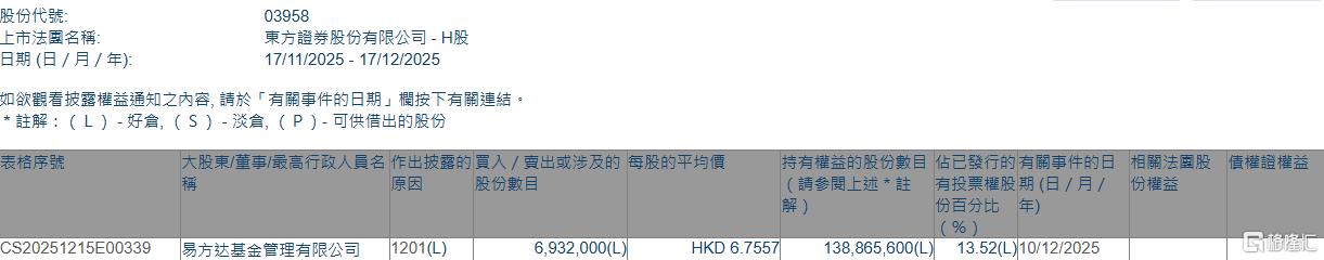 格隆汇12月17日丨根据联交所最新权益披露资料显示,2025年12月10日,东方证券(03958.HK)遭易方达基金管理有限公司在场内以每股均价6.7557港元减持693.2万股,涉资约4683.05万港元。