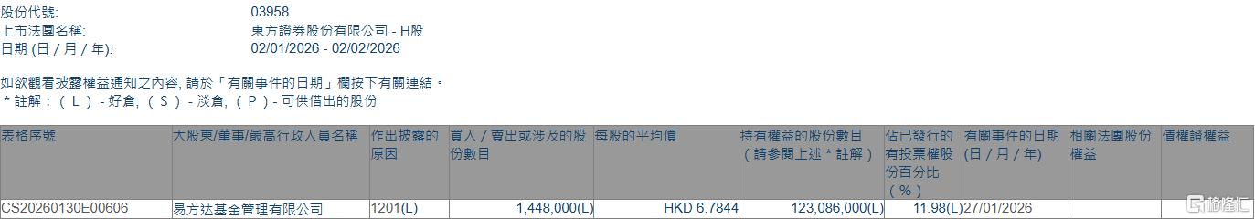 格隆汇2月2日丨根据联交所最新权益披露资料显示,2026年1月27日,东方证券(03958.HK)遭易方达基金管理有限公司在场内以每股均价6.7844港元减持144.8万股,涉资约982.38万港元。