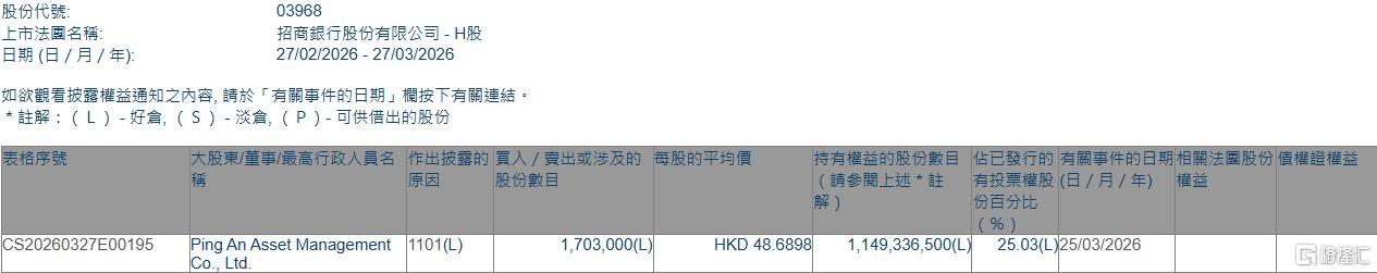 格隆汇3月27日丨根据联交所最新权益披露资料显示,2026年3月25日,招商银行(03968.HK)获Ping An Asset Management Co., Ltd.在场内以每股均价48.6898港元增持170.3万股,涉资约8291.9万港元。