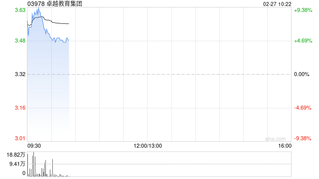 卓越教育集团(03978)盘中涨超9%,截至发稿,股价上涨4.52%,报3.47港元,成交额603.46万港元。