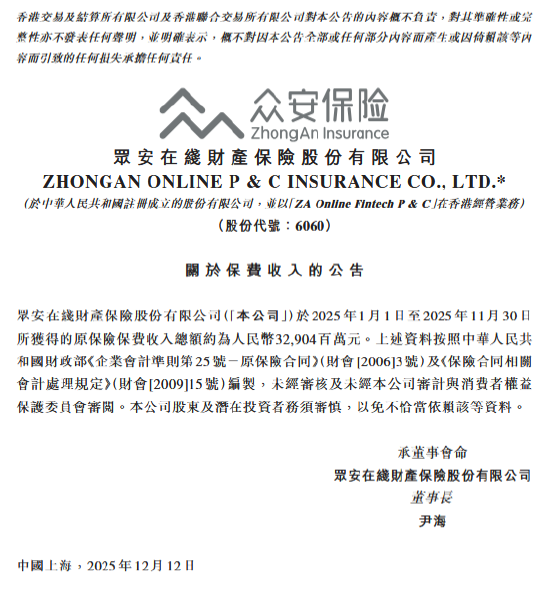 12月12日金融一线消息,众安在线今日发布保费收入公告。数据显示,公司于2025年1月1日至2025年11月30日所获得的原保险保费收入总额约为人民币329.04亿元。