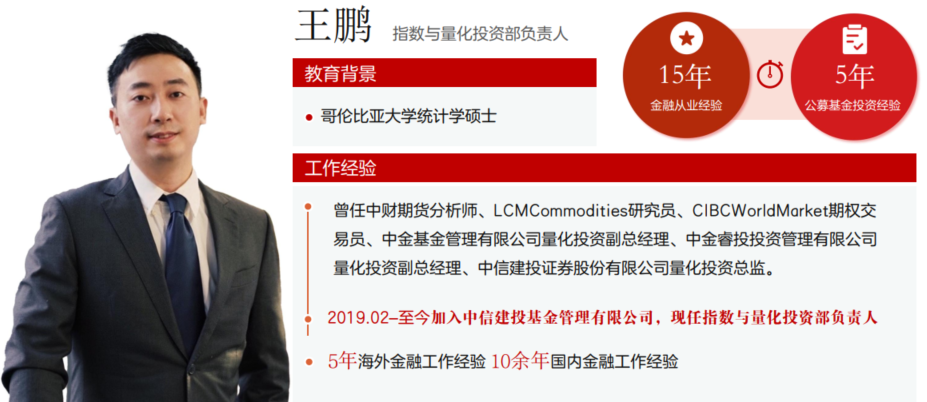 王鹏,毕业于哥伦比亚大学,统计学硕士,在美国华尔街工作5年,国内金融市场工作10余年,5年公募基金投资管理经验,拥有丰富的海内外市场投资经验和量化投资实战经验。曾任中财期货分析师、 LCMCommodities研究员、 CIBCWorldMarket期权交易员、中金基金管理有限公司量化投资副总经理、 中金睿投投资管理有限公司量化投资副总经理、 中信建投证券股份有限公司量化投资总监。2019年2月加入中信建投基金管理有限公司,现任指数与量化部门行政负责人。