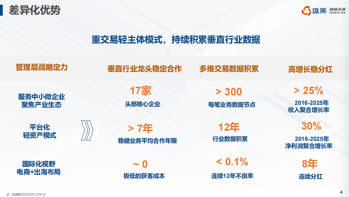 盛业是一家供应链金融科技平台,早前以商业保理业务为主,公司2021年提出平台化战略转型后采取轻资产运作战略,更聚焦平台科技服务板块,引导更多中小微企业客户的供应链资金周转需求,通过平台链接的外部资金合作方予以满足,从而减少了自有资金的投入。2025