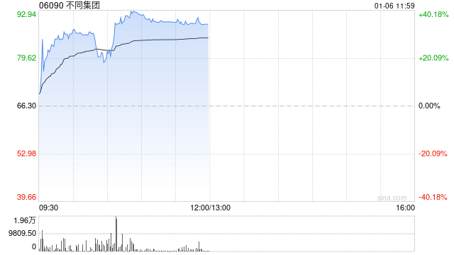 不同集团(06090)早盘股价大涨35.97%,现报90.15港元,成交额2534.40万港元。