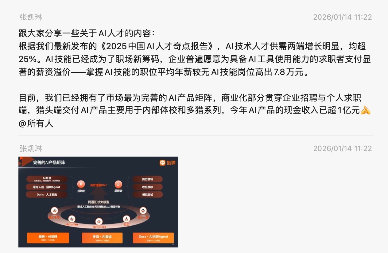 “第三季度现金回款同比转正,四季度业务进展良好,全年现金回款预计全面止跌企稳。随着今年AI产品矩阵的不断完善,新签正价客户数同比明显增长,新发职位情况7月至11月,持续同比增长。”