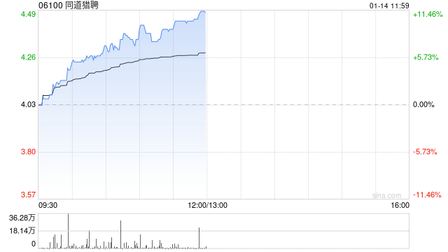 同道猎聘(06100)早盘一路走高,截至发稿,股价现报4.49港元,上涨11.41%。成交额1637.04万港元。