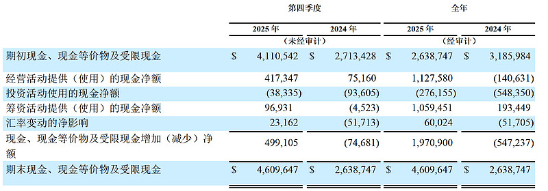 自由现金流:2025年第四季度,自由现金流为3.8亿美元,比上年同期增加3.97亿美元。2025年全年,自由现金流为9.42亿美元,比上年同期增加16亿美元。