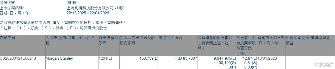 格隆汇1月22日丨根据联交所最新权益披露资料显示,2026年1月16日,剑桥科技(06166.HK)遭Morgan Stanley在场内以每股均价83.7307港元减持好仓15.38万股,涉资约1287.43万港元。