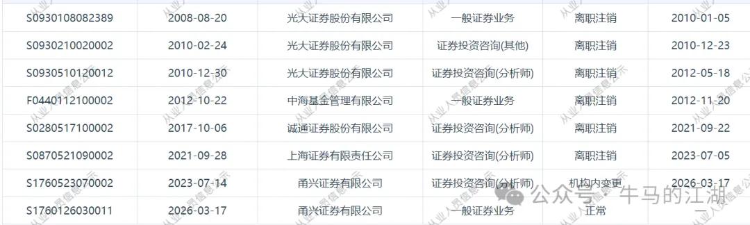 近日,证券从业系统显示。开文明的登记类别,3月17日从分析师变更为一般证券业务。